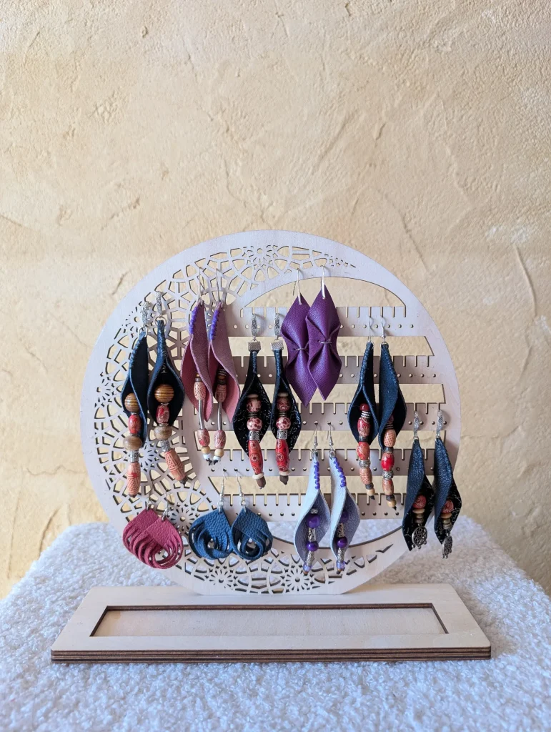 Les créations de Laurence sont très originales. Elles mêlent cuir et autres matières, tout ceci harmonisé finement et avec goût. À coup sûr de belles idées de cadeaux ! Je recommande vivement.